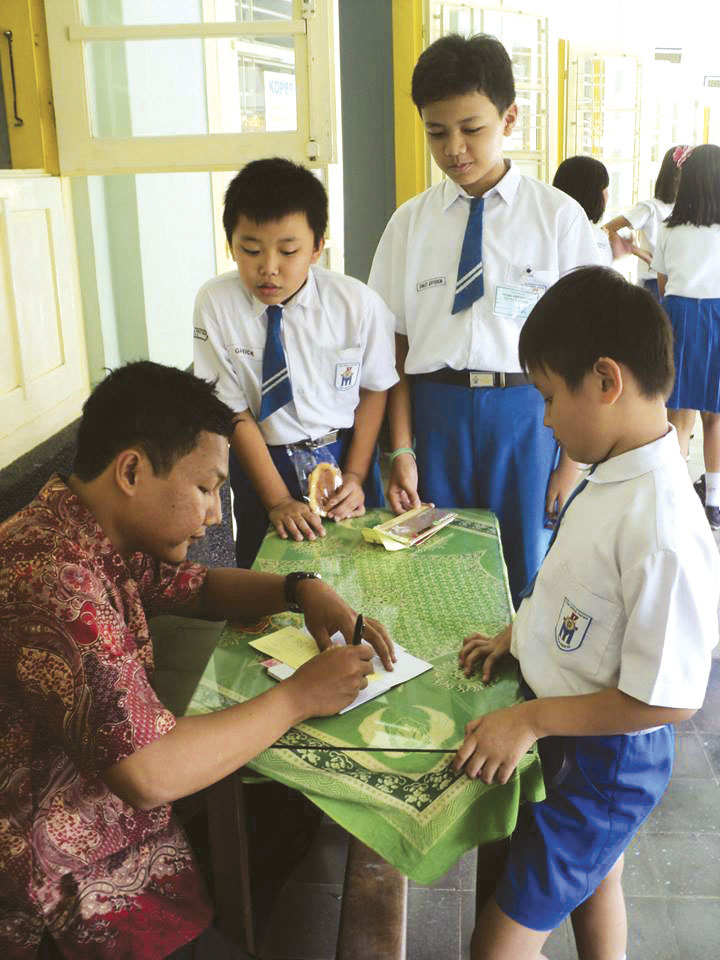 Suasana yang ramai di salah satu sudut ruangan sekolah itu memancing siswa-siswi yang lain untuk datang dan ikut berkerumun. “Saya nabung, saya nabung!” seru seorang anak sambil menunjukkan buku dan uang yang akan disimpan.